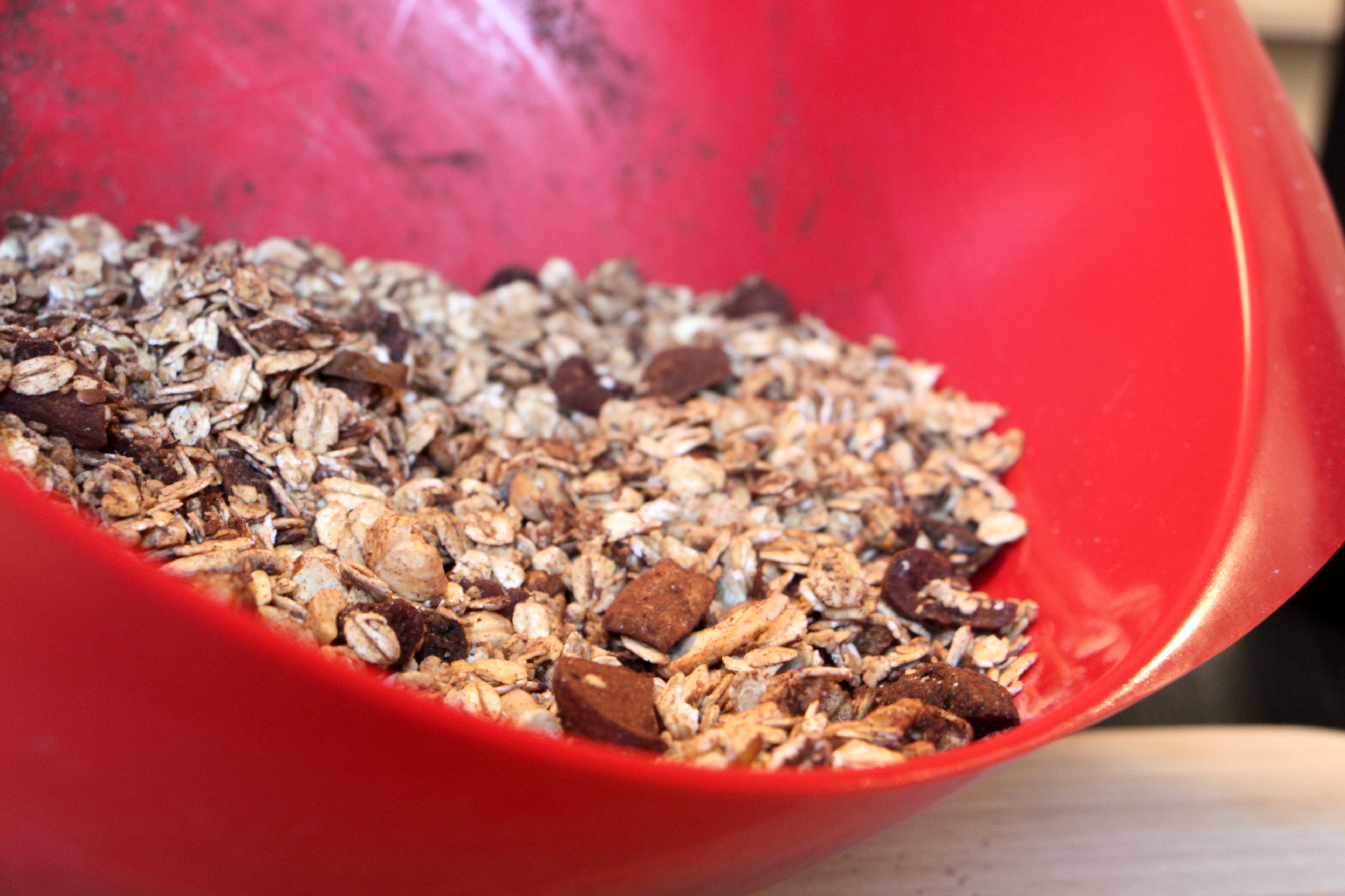 Das Knuspermüsli etwas abkühlen lassen und dann in einer Schüssel mit Kakao-, Kaffeepulver und Orangenabrieb (falls verwendet) vermischen.