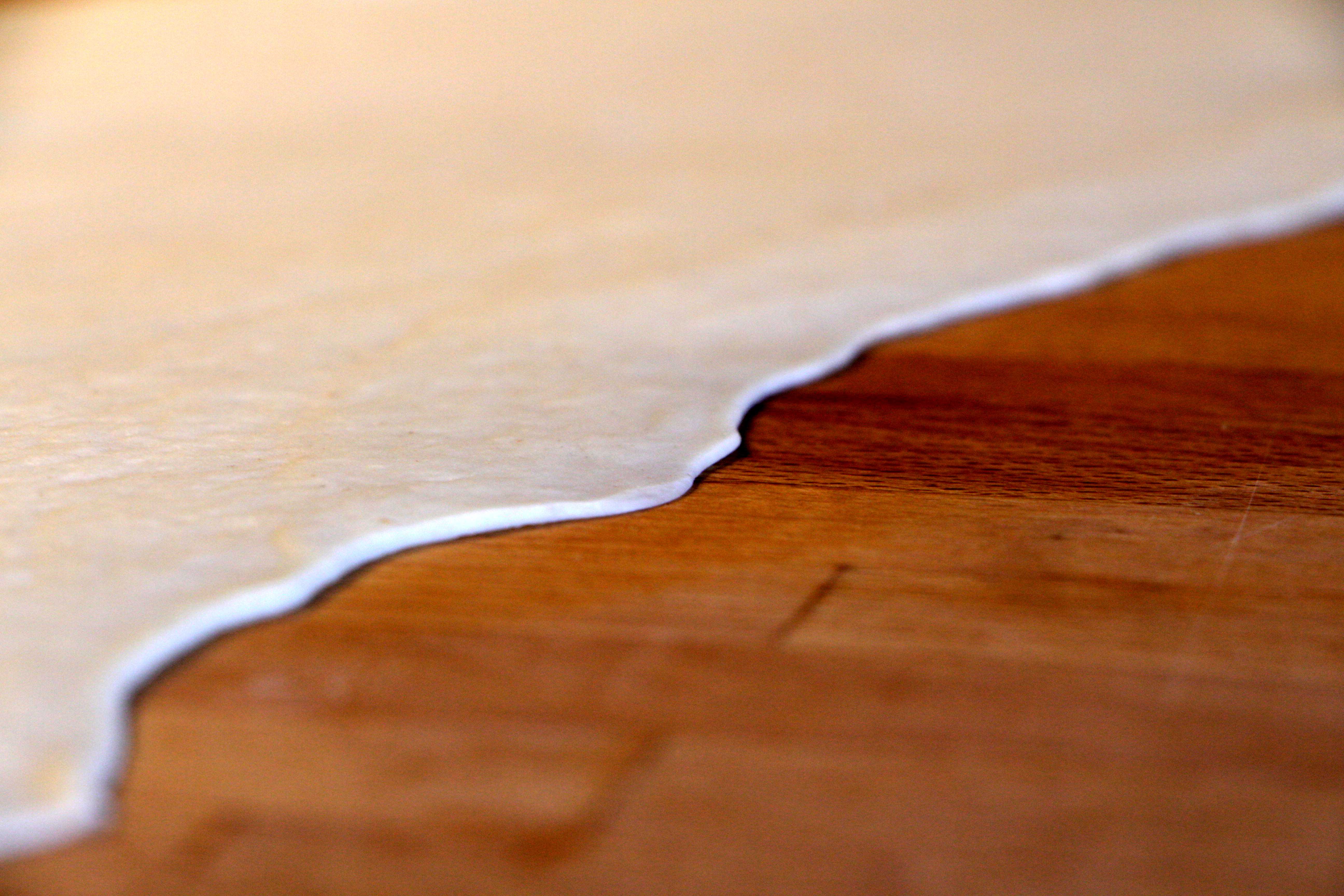 Den Teig in vier gleichgroße Portionen teilen und zwei Portionen auf leicht bemehlter Arbeitsfläche dünn ausrollen und auf die Bleche legen.